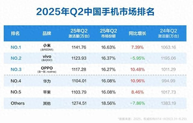 先看激活量数据:小米以微弱优势拿下第一,VIVO、OPPO紧随其后,华为第四,苹果第五。五家品牌合计占81%市场份额,差距小到1%以内,堪称"贴身肉搏"。